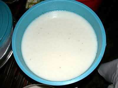 Nhào bột: hòa tan 0,6 kg bột gạo với 0,5 lít nước cốt dừa để bánh