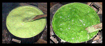 trộn và vắt, lọc lấy phần nước dùng để nấu bánh. Nước lá dứa không chỉ tạo nên