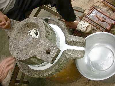 Sau khi xay ta sẽ thu được bột gạo. Do tỉ lệ nước bổ sung khi