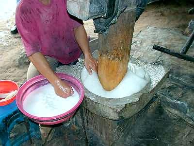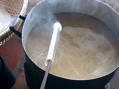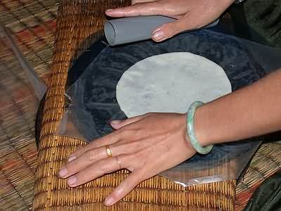 Ngoài ra, chất béo từ sữa đậu nành còn hạn chế khối bột dính vào khuôn và tay trong giai đọan tạo hình cho bánh. Đường thốt lốt được cho vào cùng với sữa đậu nành trong quá trình quết để tạo vị cho sản phẩm. Hàm lượng đường thốt lốt là 1,5%, sữa đậu nành là1,4%. Thời gian quết 15 phút. Cán định hình : Sao khi quết đều khối bột được chia thành từng bánh tròn nhỏ rồi được cán định hình chiều dày khoảng 1mm, đường kính 16cm.