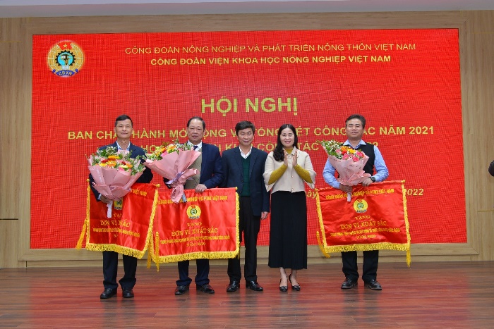 Đồng chí Hoàng Thị Hiền trao Cờ thi đua của Công đoàn Ngành cho các Công đoàn cơ sở Viện Khoa học Kỹ thuật Nông Lâm nghiệp Tây Nguyên, Viện Nghiên cứu Rau quả và Viện Di truyền Nông nghiệp